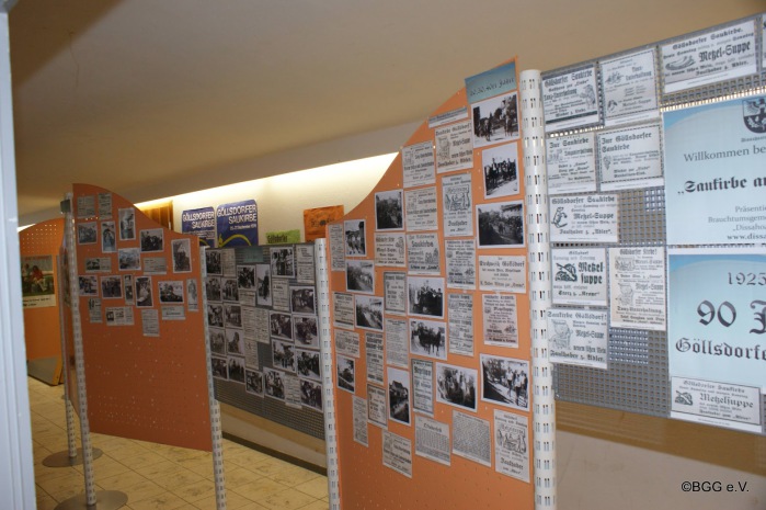 Die Ausstellung umfasst neben Bild und Filmmaterial, auch Dokumente die bis ins Entstehungsjahr 1925 zurückreichen, sowie eine Auswahl alter Plakate, Werbeanzeigen und Festmarken der Saukirbe.